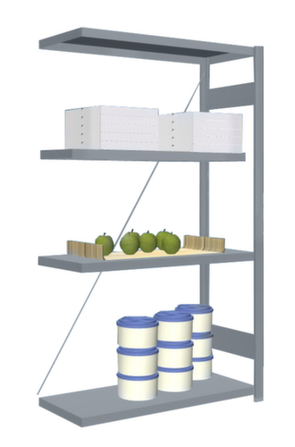 De belangrijkste maten van de hofe van de hofe stelling voor levensmiddelen in één oogopslag:4 niveaus met RVS legbord. C-vormige langsdragers met 3-voudige afkanting zorgen voor hoge stabiliteit en bescherming tegen verwondingen. vakhoogtes zijn afhankelijk van het doel en uw behoeften verstelbaar in stappen van 150 mm. gebruik eenzijdig - ontworpen voor plaatsing tegen een wand. zeer stabiel door diagonaalschoren voor lengteversteviging en gegolfde verbindingsplaten in de diepterichting. constructie van RVS, Door gegolfde verbindingsplaten in de diepterichting en stalen voetplaten staat de stelling zeer stevig. De profielafdekkappen bovenaan zorgen voor een nette afwerking. staander met voetplaat (vastschroefbaar).