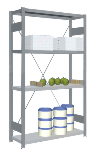De belangrijkste maten van de hofe van de hofe stelling voor levensmiddelen in één oogopslag:4 niveaus met RVS legbord. C-vormige langsdragers met 3-voudige afkanting zorgen voor hoge stabiliteit en bescherming tegen verwondingen. vakhoogtes zijn afhankelijk van het doel en uw behoeften verstelbaar in stappen van 150 mm. gebruik eenzijdig - ontworpen voor plaatsing tegen een wand. zeer stabiel door diagonaalschoren voor lengteversteviging en gegolfde verbindingsplaten in de diepterichting. constructie van RVS, Door gegolfde verbindingsplaten in de diepterichting en stalen voetplaten staat de stelling zeer stevig. De profielafdekkappen bovenaan zorgen voor een nette afwerking. staander met voetplaat (vastschroefbaar).