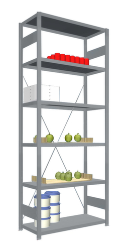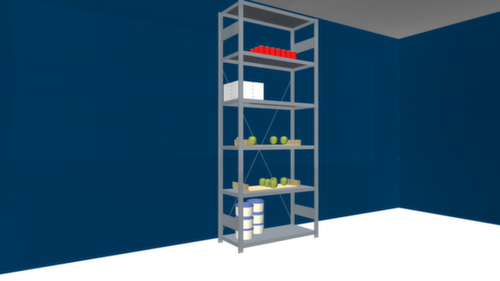 De belangrijkste maten van de hofe van de hofe stelling voor levensmiddelen in één oogopslag:6 niveaus met RVS legbord. C-vormige langsdragers met 3-voudige afkanting zorgen voor hoge stabiliteit en bescherming tegen verwondingen. vakhoogtes zijn afhankelijk van het doel en uw behoeften verstelbaar in stappen van 150 mm. gebruik eenzijdig - ontworpen voor plaatsing tegen een wand. zeer stabiel door diagonaalschoren voor lengteversteviging en gegolfde verbindingsplaten in de diepterichting. constructie van RVS, Door gegolfde verbindingsplaten in de diepterichting en stalen voetplaten staat de stelling zeer stevig. De profielafdekkappen bovenaan zorgen voor een nette afwerking. staander met voetplaat (vastschroefbaar).