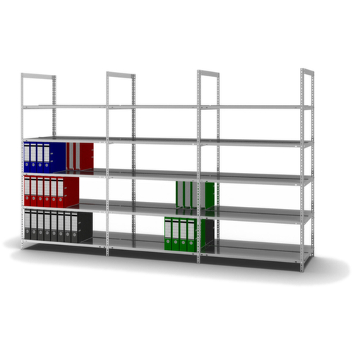 De belangrijkste maten van de hofe dossierstelling in één oogopslag:5 niveau(s) met legborden van hoogwaardig dun plaatstaal, zonder afdeklegbord / 5 ordnerhoogtes voor 60 ordners. niveaus met insteekbare middelste aanslagrand en legbordrand aan de zijkanten van het bovenste legbord (zonder extra spijlen), zorgt ervoor dat de ordners er niet uitvallen en geeft tegelijkertijd stabiliteit in de lengte- en diepterichting. De veiligheidsrand beschermt ook tegen verwonding bij het grijpen in de stelling. gebruik tweezijdig - flexibele opstelling vrijstaand in de ruimte mogelijk. constructie van staal, staanders met corrosiebeschermende zinklaag, niveaus met corrosiebeschermende zinklaag.