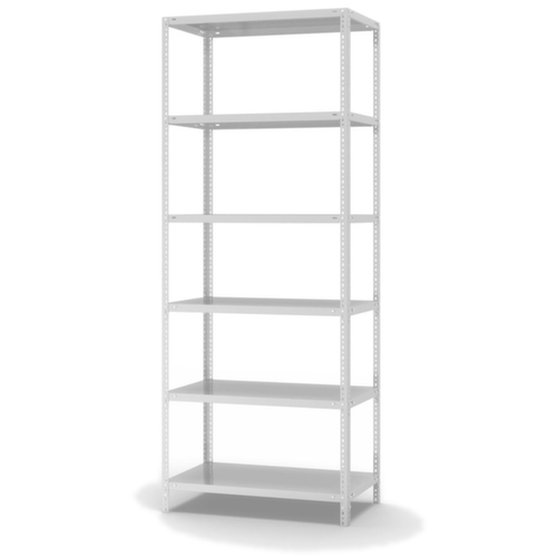 de belangrijkste maten van de hofe magazijnstelling in één oogopslag:6 niveaus met Stalen bodem. 3-voudige veiligheidsrand van 40 mm hoog en gesloten hoeken zorgt voor hoge stabiliteit en bescherming tegen verwondingen. vakhoogtes zijn afhankelijk van het doel en uw behoeften verstelbaar in stappen van 25 mm. gebruik eenzijdig - ontworpen voor plaatsing tegen een wand. constructie van staal, staanders verzinkt met kunststof coating in RAL7035 lichtgrijs, niveaus verzinkt met kunststof coating in RAL7035 lichtgrijs.