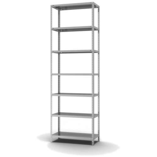 de belangrijkste maten van de hofe magazijnstelling in één oogopslag:7 niveaus met Stalen bodem. 3-voudige veiligheidsrand van 40 mm hoog en gesloten hoeken zorgt voor hoge stabiliteit en bescherming tegen verwondingen. vakhoogtes zijn afhankelijk van het doel en uw behoeften verstelbaar in stappen van 25 mm. gebruik eenzijdig - ontworpen voor plaatsing tegen een wand. constructie van staal, staanders met corrosiebeschermende zinklaag, niveaus met corrosiebeschermende zinklaag.