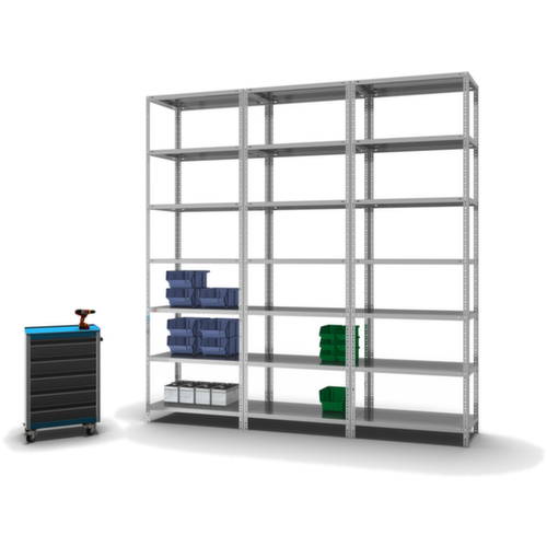 de belangrijkste maten van de hofe magazijnstelling in één oogopslag:7 niveaus met Stalen bodem. 3-voudige veiligheidsrand van 40 mm hoog en gesloten hoeken zorgt voor hoge stabiliteit en bescherming tegen verwondingen. vakhoogtes zijn afhankelijk van het doel en uw behoeften verstelbaar in stappen van 25 mm. gebruik eenzijdig - ontworpen voor plaatsing tegen een wand. constructie van staal, staanders met corrosiebeschermende zinklaag, niveaus met corrosiebeschermende zinklaag.