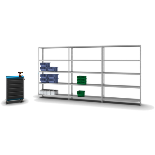 de belangrijkste maten van de hofe magazijnstelling in één oogopslag:5 niveaus met Stalen bodem. 3-voudige veiligheidsrand van 40 mm hoog en gesloten hoeken zorgt voor hoge stabiliteit en bescherming tegen verwondingen. vakhoogtes zijn afhankelijk van het doel en uw behoeften verstelbaar in stappen van 25 mm. gebruik eenzijdig - ontworpen voor plaatsing tegen een wand. constructie van staal, staanders met corrosiebeschermende zinklaag, niveaus met corrosiebeschermende zinklaag.