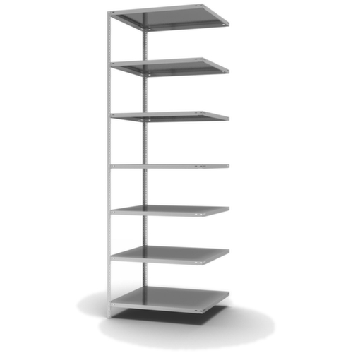 de belangrijkste maten van de hofe magazijnstelling in één oogopslag:7 niveaus met Stalen bodem. 3-voudige veiligheidsrand van 40 mm hoog en gesloten hoeken zorgt voor hoge stabiliteit en bescherming tegen verwondingen. vakhoogtes zijn afhankelijk van het doel en uw behoeften verstelbaar in stappen van 25 mm. gebruik eenzijdig - ontworpen voor plaatsing tegen een wand. constructie van staal, staanders met corrosiebeschermende zinklaag, niveaus met corrosiebeschermende zinklaag.