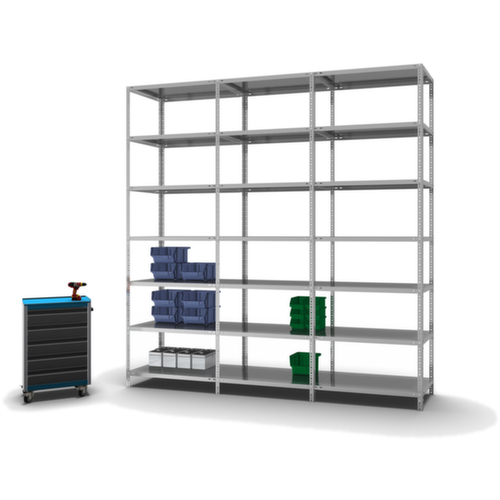 de belangrijkste maten van de hofe magazijnstelling in één oogopslag:7 niveaus met Stalen bodem. 3-voudige veiligheidsrand van 40 mm hoog en gesloten hoeken zorgt voor hoge stabiliteit en bescherming tegen verwondingen. vakhoogtes zijn afhankelijk van het doel en uw behoeften verstelbaar in stappen van 25 mm. gebruik eenzijdig - ontworpen voor plaatsing tegen een wand. constructie van staal, staanders met corrosiebeschermende zinklaag, niveaus met corrosiebeschermende zinklaag.