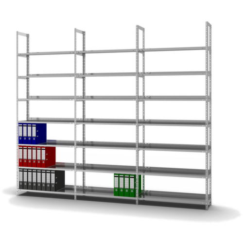 De belangrijkste maten van de hofe dossierstelling in één oogopslag:7 niveau(s) met legborden van hoogwaardig dun plaatstaal, zonder afdeklegbord / 7 ordnerhoogtes voor 84 ordners. niveaus met aanslagranden en legbordrand aan de zijkant van het bovenste vakniveau (zonder extra schoren) tegen het uitvallen van ordners en tegelijkertijd onovertroffen stabiliteit in de lengte- en diepterichting, veiligheidsrand tegen verwondingen. gebruik eenzijdig - ontworpen voor plaatsing tegen een wand. constructie van staal, staanders met corrosiebeschermende zinklaag, niveaus met corrosiebeschermende zinklaag.