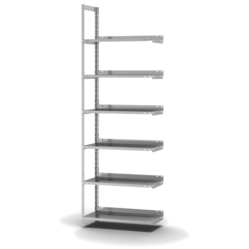 Voor uw veiligheid: volgens DIN EN 15635 moeten legbordstellingen die 4 keer zo hoog zijn als de stellingdiepte (verhouding 4:1) aan de vloer worden bevestigd en geborgd. De aangegeven vaklasten gelden bij een gelijkmatig verdeelde belasting. extra legborden/niveaus zijn leverbaar als accessoire en zijn uit te breiden tot de maximale veldlast.