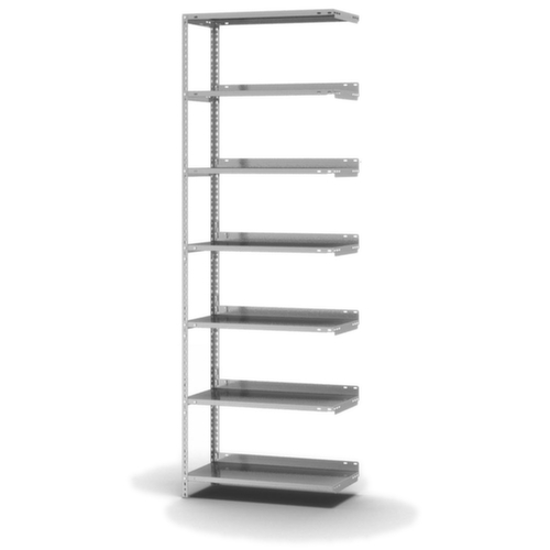 Voor uw veiligheid: volgens DIN EN 15635 moeten legbordstellingen die 4 keer zo hoog zijn als de stellingdiepte (verhouding 4:1) aan de vloer worden bevestigd en geborgd. De aangegeven vaklasten gelden bij een gelijkmatig verdeelde belasting. extra legborden/niveaus zijn leverbaar als accessoire en zijn uit te breiden tot de maximale veldlast.