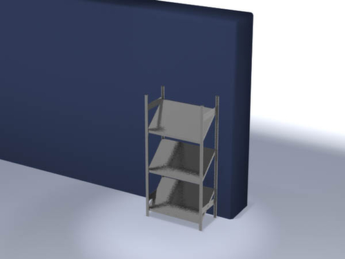 de belangrijkste maten van de hofe stelling met schuine legborden in één oogopslag:3 niveau(s) met schuin legbord, zonder afdeklegbord. de opgeslagen goederen glijden door de helling van het legbord van 34 ° zelf door hun eigen zwaartekracht naar de uitneemzijde. niveaus met voorzijde met aanslagrand om eruit vallen van goederen te voorkomen. gebruik eenzijdig - ontworpen voor plaatsing tegen een wand. Hoge stabiliteit door stabilisatieliggers. constructie van staal. staanders met corrosiebeschermende zinklaag. niveaus met corrosiebeschermende zinklaag.