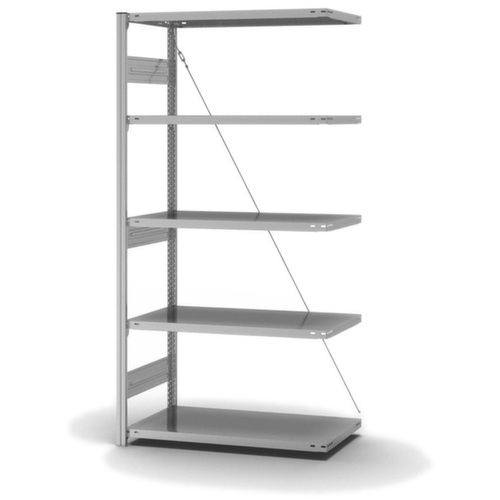 de belangrijkste maten van de hofe magazijnstelling in één oogopslag:5 niveaus met Stalen bodem. niveaus met veiligheidsrand voor bescherming tegen verwondingen. 3-voudige veiligheidsrand van 40 mm hoog en gesloten hoeken zorgt voor hoge stabiliteit en bescherming tegen verwondingen. vakhoogtes zijn afhankelijk van het doel en uw behoeften verstelbaar in stappen van 25 mm. opstelhoek recht. gebruik eenzijdig - ontworpen voor plaatsing tegen een wand. Hoge stabiliteit door diagonaalschoren. Door gegolfde verbindingsplaten in de diepterichting en stalen voetplaten staat de stelling zeer stevig. De profielafdekkappen bovenaan zorgen voor een nette afwerking. constructie van staal, staanders met corrosiebeschermende zinklaag, niveaus met corrosiebeschermende zinklaag.