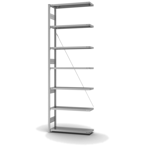 de belangrijkste maten van de hofe magazijnstelling in één oogopslag:7 niveaus met Stalen bodem. niveaus met veiligheidsrand voor bescherming tegen verwondingen. 3-voudige veiligheidsrand van 40 mm hoog en gesloten hoeken zorgt voor hoge stabiliteit en bescherming tegen verwondingen. vakhoogtes zijn afhankelijk van het doel en uw behoeften verstelbaar in stappen van 25 mm. opstelhoek recht. gebruik eenzijdig - ontworpen voor plaatsing tegen een wand. Hoge stabiliteit door diagonaalschoren. Door gegolfde verbindingsplaten in de diepterichting en stalen voetplaten staat de stelling zeer stevig. De profielafdekkappen bovenaan zorgen voor een nette afwerking. constructie van staal, staanders met corrosiebeschermende zinklaag, niveaus met corrosiebeschermende zinklaag.
