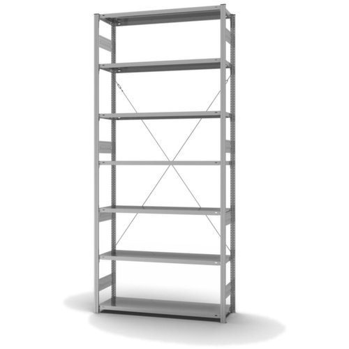 de belangrijkste maten van de hofe magazijnstelling in één oogopslag:7 niveaus met Stalen bodem. niveaus met veiligheidsrand voor bescherming tegen verwondingen. 3-voudige veiligheidsrand van 40 mm hoog en gesloten hoeken zorgt voor hoge stabiliteit en bescherming tegen verwondingen. vakhoogtes zijn afhankelijk van het doel en uw behoeften verstelbaar in stappen van 25 mm. opstelhoek recht. gebruik eenzijdig - ontworpen voor plaatsing tegen een wand. Hoge stabiliteit door diagonaalschoren. Door gegolfde verbindingsplaten in de diepterichting en stalen voetplaten staat de stelling zeer stevig. De profielafdekkappen bovenaan zorgen voor een nette afwerking. constructie van staal, staanders met corrosiebeschermende zinklaag, niveaus met corrosiebeschermende zinklaag.