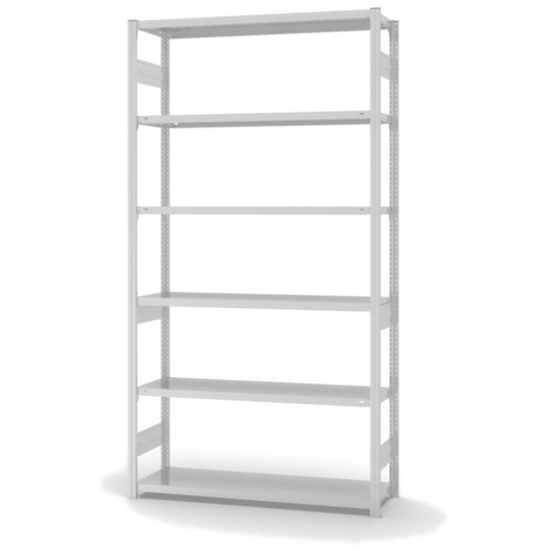 de belangrijkste maten van de hofe magazijnstelling in één oogopslag:6 niveaus met Stalen bodem. vakhoogtes zijn afhankelijk van het doel en uw behoeften verstelbaar in stappen van 25 mm. opstelhoek recht. gebruik tweezijdig - flexibele opstelling vrijstaand in de ruimte mogelijk. Hoge stabiliteit door stabilisatieliggers. Door gegolfde verbindingsplaten in de diepterichting en stalen voetplaten staat de stelling zeer stevig. De profielafdekkappen bovenaan zorgen voor een nette afwerking. constructie van staal, staanders verzinkt met kunststof coating in RAL7035 lichtgrijs, niveaus verzinkt met kunststof coating in RAL7035 lichtgrijs.