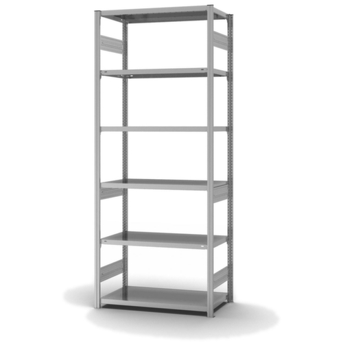 de belangrijkste maten van de hofe magazijnstelling in één oogopslag:6 niveaus met Stalen bodem. vakhoogtes zijn afhankelijk van het doel en uw behoeften verstelbaar in stappen van 25 mm. opstelhoek recht. gebruik tweezijdig - flexibele opstelling vrijstaand in de ruimte mogelijk. Hoge stabiliteit door stabilisatieliggers. Door gegolfde verbindingsplaten in de diepterichting en stalen voetplaten staat de stelling zeer stevig. De profielafdekkappen bovenaan zorgen voor een nette afwerking. constructie van staal, staanders met corrosiebeschermende zinklaag, niveaus met corrosiebeschermende zinklaag.