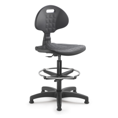 "longDescription": "<h2>Hoge draaistoel</h2><p>Deze hoge werkplaatsstoel met rugleuning wordt aanbevolen voor werkplaatsen, laboratoria of winkels. De zitting van polyurethaanschuim is bestand tegen stoten, snijden, verbranden, zure oliën en logen. Dankzij het materiaal is hij heel gemakkelijk af te wassen en ideaal voor gebruik in ruimtes die snel vuil worden. Je hebt de mogelijkheid om de zithoogte van de bureaustoel in te stellen van 55 cm tot 80 cm. Afhankelijk van het feit of je de bureaustoel als praktische draaistoel wilt gebruiken of beweging in je lichaam wilt brengen en hem als stahulp wilt gebruiken, kun je op de bureaustoel ook je voeten laten rusten en ondersteunen met een voetensteun die ook in hoogte verstelbaar is. Een comfort dat niet beschikbaar is met een standaard draaikruk. Je kunt ook gewoon achterover leunen als dat nodig is en afhankelijk van de belasting. De kantelbare rugleuning maakt flexibele bewegingen op de draaibare bureaustoel mogelijk. De zitting en rugleuning met permanent contact passen zich aan de bewegingen van de rug aan en zorgen zo voor meer comfort. Alle details: - Kantelbare rugleuning - Hoogteverstelling van 55 tot 80 cm met behulp van een gasdrukveer. - Zitting: B 47 x D 43 cm - Rugleuning: B 41 x H 31 cm - In hoogte verstelbare voetsteun: diameter 44 cm - Materiaal zitting en rugleuning: polyurethaan - Zitting vergrendelt in zitpositie, gemakkelijk te verplaatsen wanneer niet belast - Rugleuning met geïntegreerde handgreep - Voetsteun Ø 46 cm, in hoogte verstelbaar van 19 tot 43 cm - Kruisvoet van zwart nylon Veilig werken in een gezonde, comfortabele omgeving is de beste garantie voor zakelijk succes. Hoe creëer je een gelukkige werkomgeving: ontdek gewoon onze producten voor ergonomisch werkplekontwerp.</p><br>",
