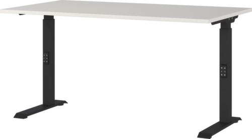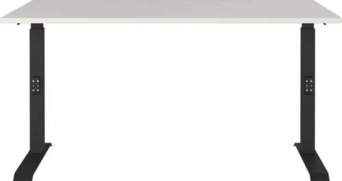blad van spaanplaat met onderhoudsvriendelijke melamineharscoating in decor lichtgrijs. plaatvorm hoekig. rand alle randen zijn door slagvaste ABS-randen beschermd tegen ontsierende scheuren en beschadigingen. C-voetonderstel van metaal met slag- en krasvaste poedercoating in zwart. hoogteverstelling door mechanisme. frame met Kunststof glijders.