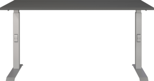 blad van spaanplaat met onderhoudsvriendelijke melamineharscoating in decor grafiet. plaatvorm hoekig. rand alle randen zijn door slagvaste ABS-randen beschermd tegen ontsierende scheuren en beschadigingen. C-voetonderstel van metaal met slag- en krasvaste poedercoating in zilverkleurig. hoogteverstelling door mechanisme. frame met Kunststof glijders.