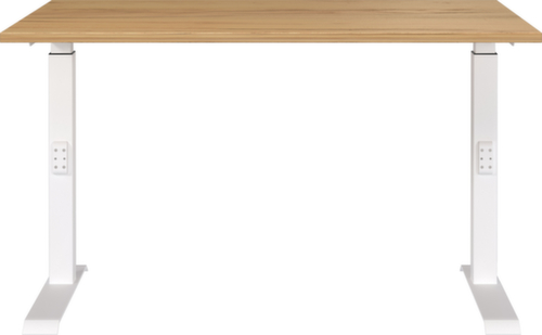 blad van spaanplaat met onderhoudsvriendelijke melamineharscoating in decor Navarra-eiken. rand met slagvaste ABS-omranding ter bescherming tegen lelijke barsten en beschadigingen. C-voetonderstel van metaal met slag- en krasvaste poedercoating in wit. hoogteverstelling door mechanisme. frame met nivelleerbare kunststof glijders, ideaal voor het opheffen van oneffenheden in de vloer.