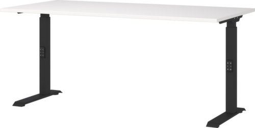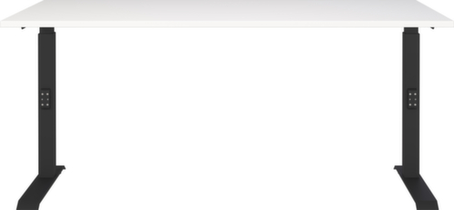 blad van spaanplaat met krasvaste en onderhoudsvriendelijke melamineharscoating in decor wit. rand alle randen zijn door slagvaste ABS-randen beschermd tegen ontsierende scheuren en beschadigingen. C-voetonderstel van metaal met slag- en krasvaste poedercoating in zwart. hoogteverstelling door mechanisme. frame met nivelleerbare kunststof glijders, ideaal voor het opheffen van oneffenheden in de vloer.