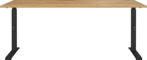 blad van spaanplaat met krasvaste en onderhoudsvriendelijke melamineharscoating in decor Navarra-eiken. rand alle randen zijn door slagvaste ABS-randen beschermd tegen ontsierende scheuren en beschadigingen. C-voetonderstel van metaal met slag- en krasvaste poedercoating in zwart. hoogteverstelling door mechanisme. frame met nivelleerbare kunststof glijders, ideaal voor het opheffen van oneffenheden in de vloer.