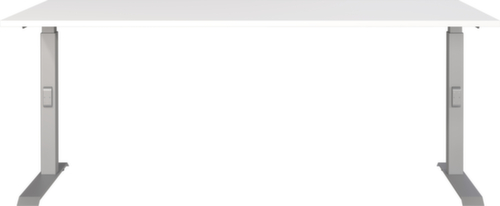 blad van spaanplaat met krasvaste en onderhoudsvriendelijke melamineharscoating in decor wit. rand alle randen zijn door slagvaste ABS-randen beschermd tegen ontsierende scheuren en beschadigingen. C-voetonderstel van metaal met slag- en krasvaste poedercoating in zilverkleurig. hoogteverstelling door mechanisme. frame met nivelleerbare kunststof glijders, ideaal voor het opheffen van oneffenheden in de vloer.