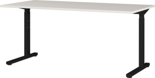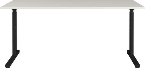 blad van spaanplaat met onderhoudsvriendelijke melamineharscoating in decor lichtgrijs. plaatvorm rechthoekig. rand met stootvaste ABS-lijmrand. C-voetonderstel van metaal met slag- en krasvaste poedercoating in zwart. Buisvorm rechthoekige buis. hoogteverstelling door inbusschroeven. frame met stel-glijvoetjes.