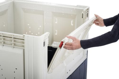 van slagvast polyethyleen in zwart/ivoorkleurig. De opgeslagen goederen zijn door de gesloten wanden beschermd tegen stof en de bak is gemakkelijk te reinigen, met klep voor gemakkelijkere toegang en uitname. legbord gesloten. Dankzij de 3 sleden gemakkelijk te verplaatsen en in te rijden met een heftruck. Ruimtebesparend op te bergen, en eenvoudig en snel open- en inklapbaar voor gebruik. Nauwkeurig stapelbaar in samen- en opengeklapte toestand door speciaal profiel op de bodem.