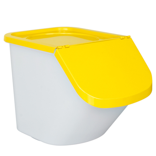 van breukvast polypropyleen. bak in wit en deksel in geel. wanden: gladde, naadloze vlakken voor eenvoudige reiniging. uitgerust met steekplaat, die conform de HACCP-richtlijnen in de bak kan worden opgehangen. geschikt voor elke soort stortgoed. afsluitbaar met klapdeksel. Het deksel kan ook worden geopend als er meerdere boxen op elkaar zijn gestapeld. Door de afgeschuinde grijpopening is de bakinhoud gemakkelijk toegankelijk. geschikt voor levensmiddelen.