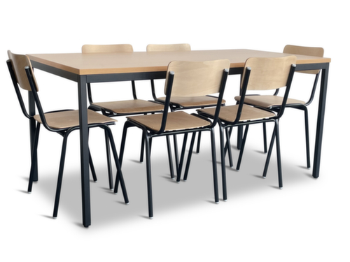 kenmerken:zitting van beuken multiplex in natuur. rug van beuken multiplex in natuur. stoelen met 4-voetonderstel van staal gelakt in zwart. tafel stoelen met 4-voetonderstel van staal gelakt in zwart. blad van spaanplaat met onderhoudsvriendelijke melamineharscoating in decor beuken. frame met vloervriendelijke glijders. tafel hoogte x breedte x diepte 740 x 1600 x 800 mm. De stoelen zijn om ruimte te besparen meervoudig stapelbaar.
