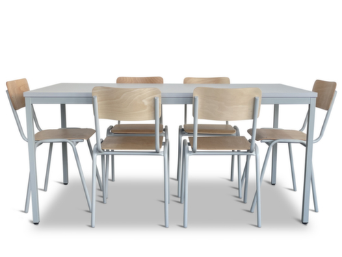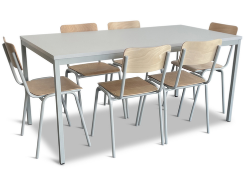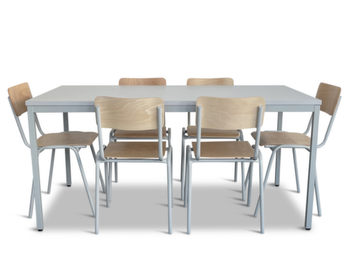 kenmerken:zitting van beuken multiplex in natuur. rug van beuken multiplex in natuur. stoelen met 4-voetonderstel van staal gelakt in lichtgrijs. tafel stoelen met 4-voetonderstel van staal gelakt in grijs. blad van spaanplaat met onderhoudsvriendelijke melamineharscoating in decor grijs. frame met vloervriendelijke glijders. tafel hoogte x breedte x diepte 740 x 1600 x 800 mm. De stoelen zijn om ruimte te besparen meervoudig stapelbaar.