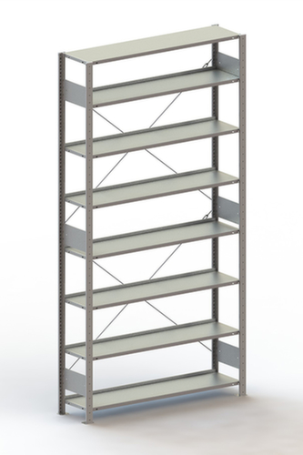 De belangrijkste maten van de META van de META inhaakstelling in één oogopslag:Op 8 niveau(s) met Stalen bodem / 7 ordnerhoogtes kunt u dossiers, ordners en overig kantoormateriaal optimaal ordenen. niveaus met aanslagrand aan achterzijde om te voorkomen dat ordners eruit vallen. vakhoogtes zijn afhankelijk van het doel en uw behoeften verstelbaar in stappen van 25 mm. M-vormige langsdragers met 5-voudige afkanting zorgen voor hoge stabiliteit en bescherming tegen verwondingen. gebruik eenzijdig - ontworpen voor plaatsing tegen een wand. Hoge stabiliteit door diagonaalschoren. constructie van staal. staanders verzinkt met slag- en krasbestendige poedercoating in RAL7035 lichtgrijs. niveaus verzinkt met slag- en krasbestendige poedercoating in RAL7035 lichtgrijs.