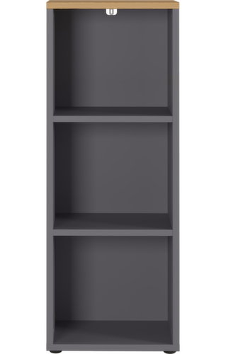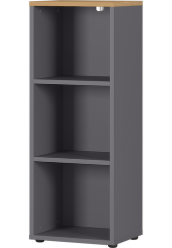 De belangrijkste maten van de van de kantoorstelling GW-AGENDA GW-AGENDA in één oogopslag:gemakkelijk toegankelijke opbergruimte voor dossiers en werkdocumenten, met 3 ordnerhoogtes. constructie van spaanplaat met onderhoudsvriendelijke melamineharscoating. legbordranden zijn beschermd tegen ontsierende scheuren en beschadigingen door een slagvaste ABS-rand. romp in grafietgrijs/Grandson-eiken. niveaus grafiet. onderbouw glijders.