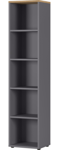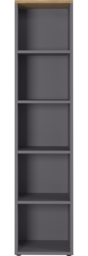 De belangrijkste maten van de van de kantoorstelling GW-AGENDA GW-AGENDA in één oogopslag:gemakkelijk toegankelijke opbergruimte voor dossiers en werkdocumenten, met 5 ordnerhoogtes. constructie van spaanplaat met onderhoudsvriendelijke melamineharscoating. legbordranden zijn beschermd tegen ontsierende scheuren en beschadigingen door een slagvaste ABS-rand. romp in grafietgrijs/Grandson-eiken. niveaus grafiet. onderbouw glijders.