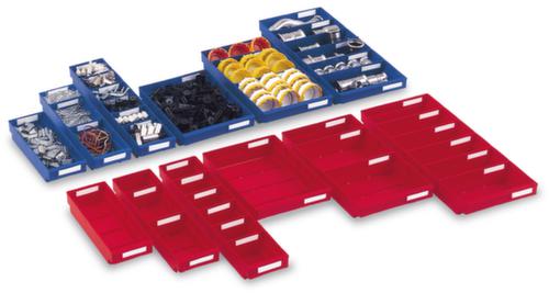 "longDescription": "<h2>Plankdoos</h2><strong>extra plat</strong><br><ul><li>Gemaakt van onbreekbaar polypropyleen</li><li>Met versterkte voet en etikethouder </li><li>Dwarsverdelers kunnen in de laterale groefgeleiders en extra bodembevestigingen worden gestoken om de ruimte te verdelen, met etikethouder </li><li>Kruisverdelers en etiketten tegen meerprijs</li></ul><br>Perfecte oplossing voor het opbergen van kleine onderdelen - Met een hoogte van 65 mm is deze extra platte legbordkast van Kappes ideaal voor het ruimtebesparend en tegelijkertijd overzichtelijk opbergen van kleine onderdelen op het legbord. Gemaakt van breukvast polypropyleen en met een versterkte bodem, gaat deze opbergdoos gegarandeerd lang mee. Bovendien is hij dimensionaal stabiel ondanks zijn lage eigen gewicht. De gladde oppervlakken zijn gemakkelijk schoon te maken en behouden hun vorm, zelfs bij extreme temperaturen. Meerdere dozen kunnen op elkaar worden gestapeld om ruimte te besparen en zo kunnen ook meerdere opbergdozen met open voorzijde gemakkelijk worden opgeborgen.<br><br>Voor een beter overzicht is de opbergbox verkrijgbaar in rood en blauw en reeds voorzien van een voorbereiding voor extra insteekbare dwarsverdelers, die tegen meerprijs verkrijgbaar zijn. Elk tussenschot, evenals de doos zelf, kan worden voorzien van etiketten, zodat u de inhoud van de vakken gemakkelijk en snel kunt indelen.<br><strong>Goed om te weten!</strong><br>Heeft u slechts enkele bakken nodig? Voor deze bakken geldt geen minimum bestelhoeveelheid en ze zijn per stuk te bestellen.<br>",