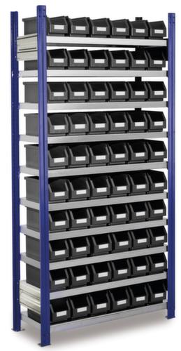 de belangrijkste maten van de Kappes bakkenstelling in één oogopslag:overzichtelijke onderdelenopslag op 10 niveaus met Stalen bodem en 60 bakken. niveau(s) met veiligheidsrand voor bescherming tegen verwondingen. gebruik eenzijdig - ontworpen voor plaatsing tegen een wand. constructie van staal. staanders met slag- en krasvaste poedercoating in RAL5010 gentiaanblauw.