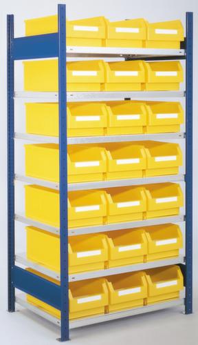 de belangrijkste maten van de Kappes bakkenstelling in één oogopslag:overzichtelijke onderdelenopslag op 7 niveaus met Stalen bodem en 21 bakken. niveau(s) met veiligheidsrand voor bescherming tegen verwondingen. gebruik eenzijdig - ontworpen voor plaatsing tegen een wand. constructie van staal. staanders met slag- en krasvaste poedercoating in RAL5010 gentiaanblauw.