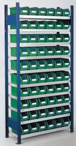 de belangrijkste maten van de Kappes bakkenstelling in één oogopslag:overzichtelijke onderdelenopslag op 10 niveaus met Stalen bodem en 60 bakken. niveau(s) met veiligheidsrand voor bescherming tegen verwondingen. gebruik eenzijdig - ontworpen voor plaatsing tegen een wand. constructie van staal. staanders met slag- en krasvaste poedercoating in RAL5010 gentiaanblauw.