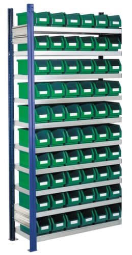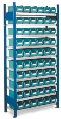 de belangrijkste maten van de Kappes bakkenstelling RasterPlan® in één oogopslag:overzichtelijke onderdelenopslag op 10 niveaus met Stalen bodem en 60 bakken. vakhoogtes zijn afhankelijk van het doel en uw behoeften verstelbaar in stappen van 25 mm. gebruik eenzijdig - ontworpen voor plaatsing tegen een wand. constructie van staal. staanders met slijtvaste kunststof coating in gentiaanblauw. niveaus met corrosiebeschermende zinklaag.