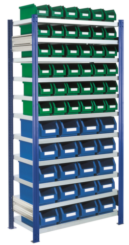 de belangrijkste maten van de Kappes bakkenstelling RasterPlan® in één oogopslag:overzichtelijke onderdelenopslag op 11 niveaus met Stalen bodem en 56 bakken. vakhoogtes zijn afhankelijk van het doel en uw behoeften verstelbaar in stappen van 25 mm. gebruik eenzijdig - ontworpen voor plaatsing tegen een wand. constructie van staal. staanders met slijtvaste kunststof coating in gentiaanblauw. niveaus met corrosiebeschermende zinklaag.