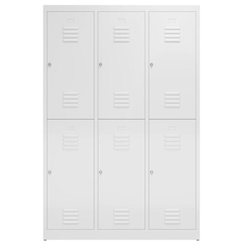 per vak 1 kledingstang en 2 dubbele haken per vak. openslaande deur met ventilatiesleuven. afsluitbaar met klinksluiting voor hangslot. elk vak apart afsluitbaar. De sokkel onder de kast zorgt ervoor dat het gewicht van de kast gelijkmatig over de vloer wordt verdeeld. Hierdoor staat de kast stabieler en kan hij zwaardere lasten dragen dan een kast met voeten. En omdat er geen vuil, stof en vocht onder kan komen, hoeft er onder de kast niet te worden schoongemaakt. constructie van staal, gelast. romp met elektrostatische poedercoating in RAL9003 signaalwit, front met elektrostatische poedercoating in RAL9003 signaalwit.