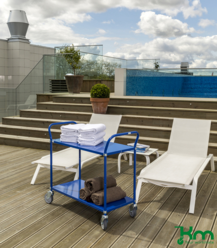 etage(s) van metaal met slag- en krasvaste poedercoating. etage(s) met beschermrand. duwbeugel hoog. onderstel elektrolytisch gegalvaniseerd in zilverkleurig. constructie van staal. Gemakkelijk te manoeuvreren en verrijden door 4 zwenkwielen. wiel Ø 125 mm. wielen met vloervriendelijke TPE-banden op breukvaste en robuuste polypropyleen-velg. wielnaaf met Precisiekogellager. behuizing van staal. montage-instructie: legborden met opstaande rand kunnen onder of boven worden gemonteerd.