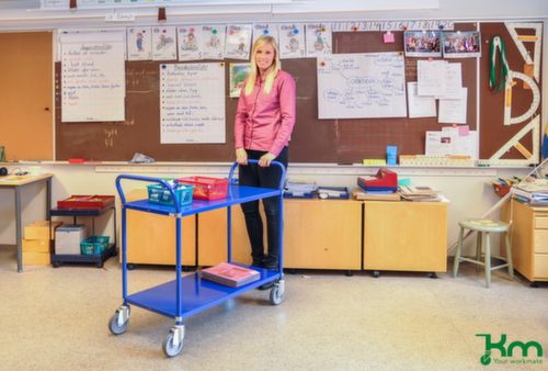 etage(s) van metaal met slag- en krasvaste poedercoating. etage(s) met beschermrand. duwbeugel hoog. onderstel elektrolytisch gegalvaniseerd in zilverkleurig. constructie van staal. Gemakkelijk te manoeuvreren en verrijden door 4 zwenkwielen, remmen op twee zwenkwielen zorgen altijd voor een stevige stand. wiel Ø 125 mm. wielen met vloervriendelijke TPE-banden op breukvaste en robuuste polypropyleen-velg. wielnaaf met Precisiekogellager. behuizing van staal. montage-instructie: legborden met opstaande rand kunnen onder of boven worden gemonteerd.