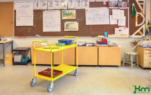 etage(s) van metaal met slag- en krasvaste poedercoating in geel. etage(s) met beschermrand. duwbeugel hoog. frame met slag- en krasvaste poedercoating. constructie van staal. Gemakkelijk te manoeuvreren en verrijden door 4 zwenkwielen. wiel Ø 125 mm. wielen met vloervriendelijke TPE-banden op breukvaste en robuuste polypropyleen-velg. wielnaaf met Precisiekogellager. behuizing van staal. montage-instructie: legborden met opstaande rand kunnen onder of boven worden gemonteerd.