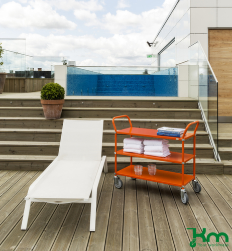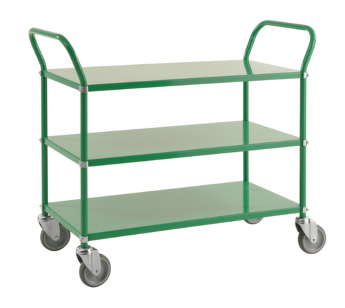 etage(s) van metaal met slag- en krasvaste poedercoating in groen. etage(s) met beschermrand. duwbeugel hoog. onderstel met slag- en krasvaste poedercoating in groen. constructie van staal. Gemakkelijk te manoeuvreren en verrijden door 4 zwenkwielen. wiel Ø 125 mm. wielen met vloervriendelijke TPE-banden op breukvaste en robuuste polypropyleen-velg. wielnaaf met Precisiekogellager. behuizing van staal. montage-instructie: legborden met opstaande rand kunnen onder of boven worden gemonteerd.