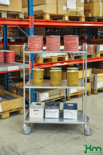 etage(s) van metaal met slag- en krasvaste poedercoating in blauw. etage(s) met beschermrand, recht. onderstel met slag- en krasvaste poedercoating in blauw. staalconstructie. Gemakkelijk te manoeuvreren en verrijden door 4 zwenkwielen, De rem aan 2 zwenkwielen zorgen voor een stevige stand. wiel Ø 125 mm. wielen met vloervriendelijke TPE-banden op breukvaste en robuuste polypropyleen-velg. wielnaaf met Precisiekogellager. behuizing van staal.Onze klantenservice helpt u graag verder.