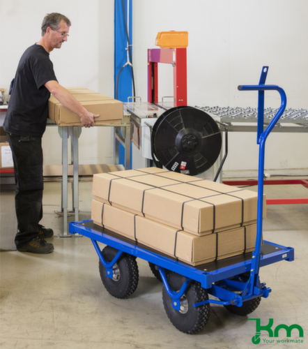 platform van Multiplex. dissel met oog om aan te hangen. staalconstructie, stevig gelast. Dit geeft de constructie de nodige stevigheid en stabiliteit om hem voor allerlei toepassingen in te zetten. onderstel met slag- en krasvaste poedercoating in blauw. 4 bokwielen. wiel Ø 300 mm. wielen met vloervriendelijke en geluidsarme lucht-banden op staal-velg. wielnaaf met wiellager. remmen via dissel, werkt op de voorwielen. wielstand parallel.