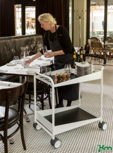 etage(s) van staal met rubber laag in zwart. etage(s) met rand aan de lange zijden. randhoogte 31 mm. met 2 legborden. duwbeugel hoog. onderstel met slag- en krasvaste poedercoating in wit. constructie van staal. Gemakkelijk te manoeuvreren en verrijden door 4 zwenkwielen, 2 wielen met rem. wiel Ø 100 mm. met vloervriendelijke TPE-banden. wielnaaf met voor continu gebruik geschikte kogellager. wielstand rechthoekig.