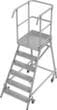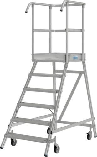 van aluminium. veilig in gebruik door bordes met leuning aan 3 zijden en met kniereling en plint. balustrade 1000 mm hoog. leuning als accessoire (niet bij inhoud levering inbegrepen). Gemakkelijk te manoeuvreren en verrijden door 4 zwenkwielen, De rem aan 2 zwenkwielen zorgen voor een stevige stand. Belastbaar tot 150 kg. gewicht 42,3 kg.