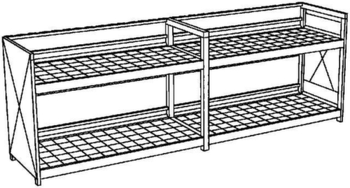 de belangrijkste maten van de Lacont stelling voor gevaarlijke stoffen in één oogopslagframe gelast. bodemopvangbak met 450 l opvangvolume, met hijsogen voor gemakkelijk leeg transporteren. opvangbak van staal verzinkt met lak in RAL 5015 hemelsblauw. thermisch verzinkte voetplaten voorbereid voor vloermontage.